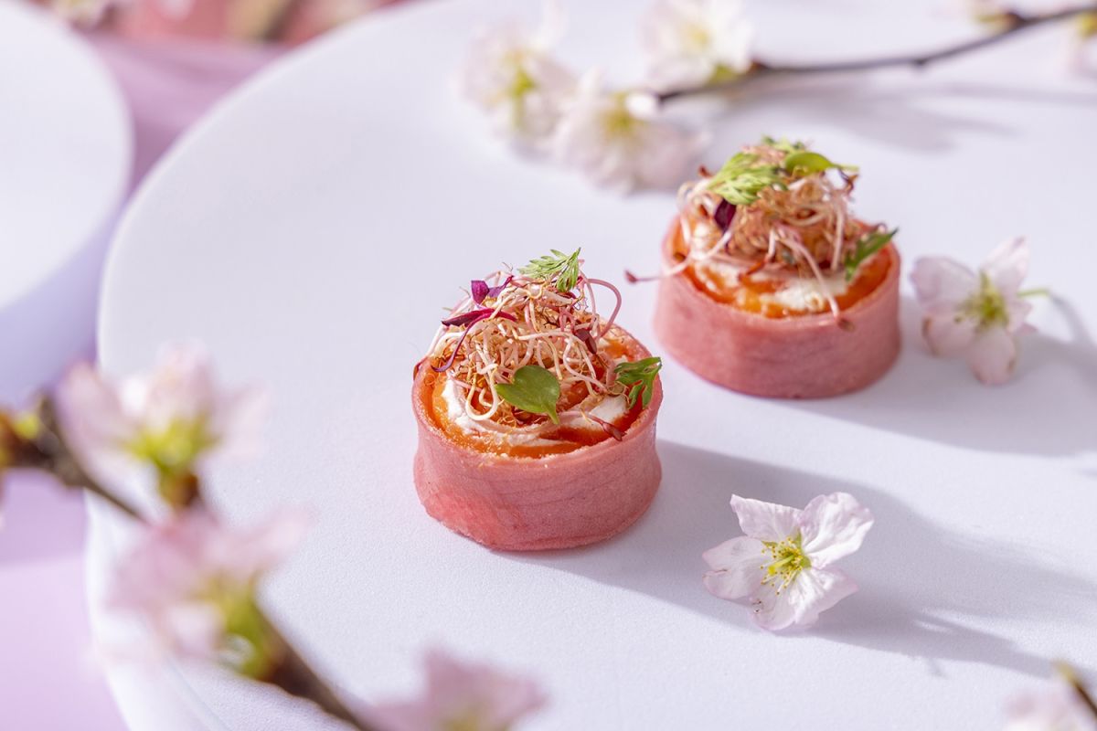 ビーツで色付けをしたまろやかな口当たりのヴィシソワーズに、桜ピューレをのせてアクセントをプラス。生ハムと花びらに見立てた百合根のトッピングで満開の桜を表現。
