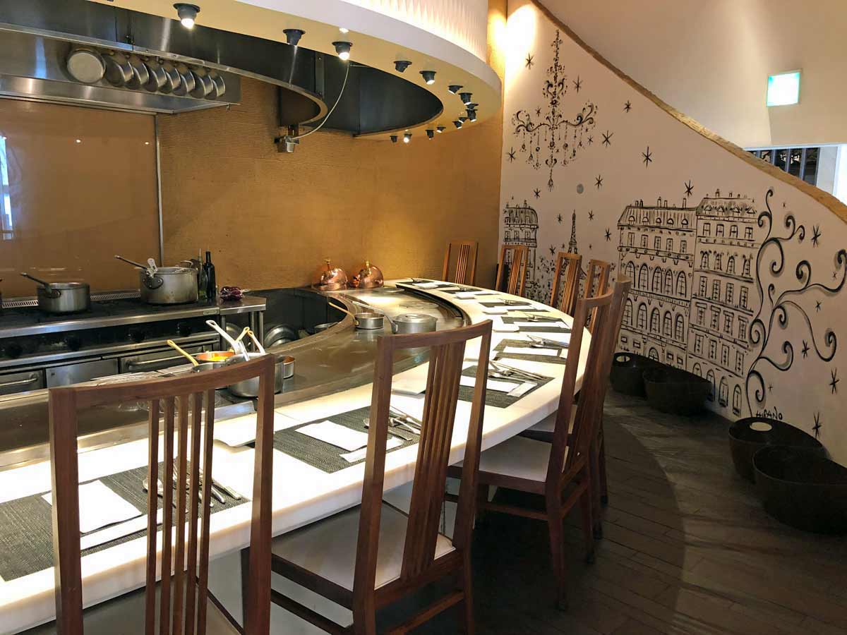 「ahill ginza(あひる ぎんざ)」があるのは、銀座ベルビア館の8階。店内は明るく開放感があり、1人でも過ごしやすい雰囲気です。おひとり様でも気兼ねなく過ごせるカウンター席は、バックの壁にパリをモチーフにした絵が描かれていて、とっても優雅! 目の前で繰り広げられる鉄板焼の臨場感を味わえるので、おすすめですよ。