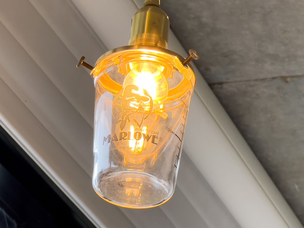 店内には窓際にイートインスペースが設けられており、見上げるとビーカーの照明が! ドリンクは「コーヒー」、「アッサムティー」、「カモミールティー」各486円などを提供しています。