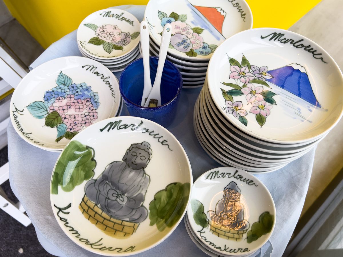 プリンやソフトクリームのほかに鎌倉限定のオリジナル絵皿など雑貨の販売もあります。プリン型のエコバッグ800円や、ビーカープリン型のピンバッチ660円など、ユニークなアイテムもおすすめ。