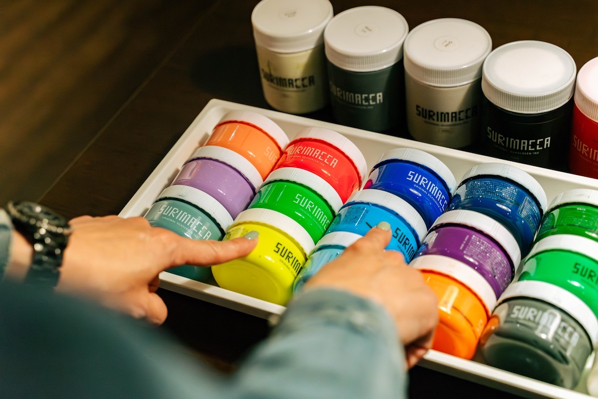 シルクスクリーンとは、メッシュ状になった版にインクを落としてプリントする技法のこと。“アートを身につける”ことがコンセプトのひとつでもあるので、すでにアートが落とし込まれた既成の版から好きなものを選んでプリントしていく形です。