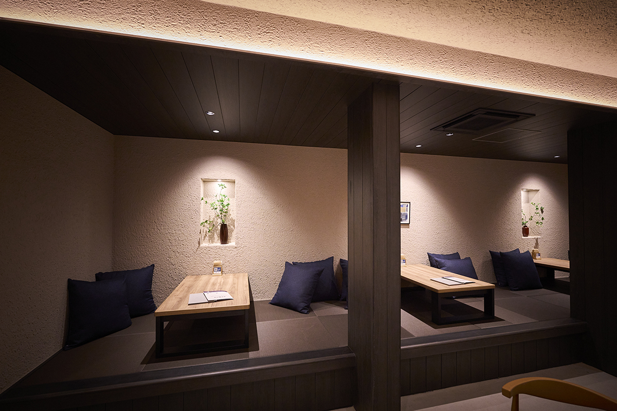 81席(テーブル席69席、座敷席12席)と広々とした空間では、少し落とし気味の照明の座敷席でくつろぐのもよし、開放感のあるテーブル席で食事を楽しむのもよし。店内の至る所に和テイストのお花や絵画が飾られていますが、かしこまりすぎずカジュアルな雰囲気で気軽に利用することができますよ。