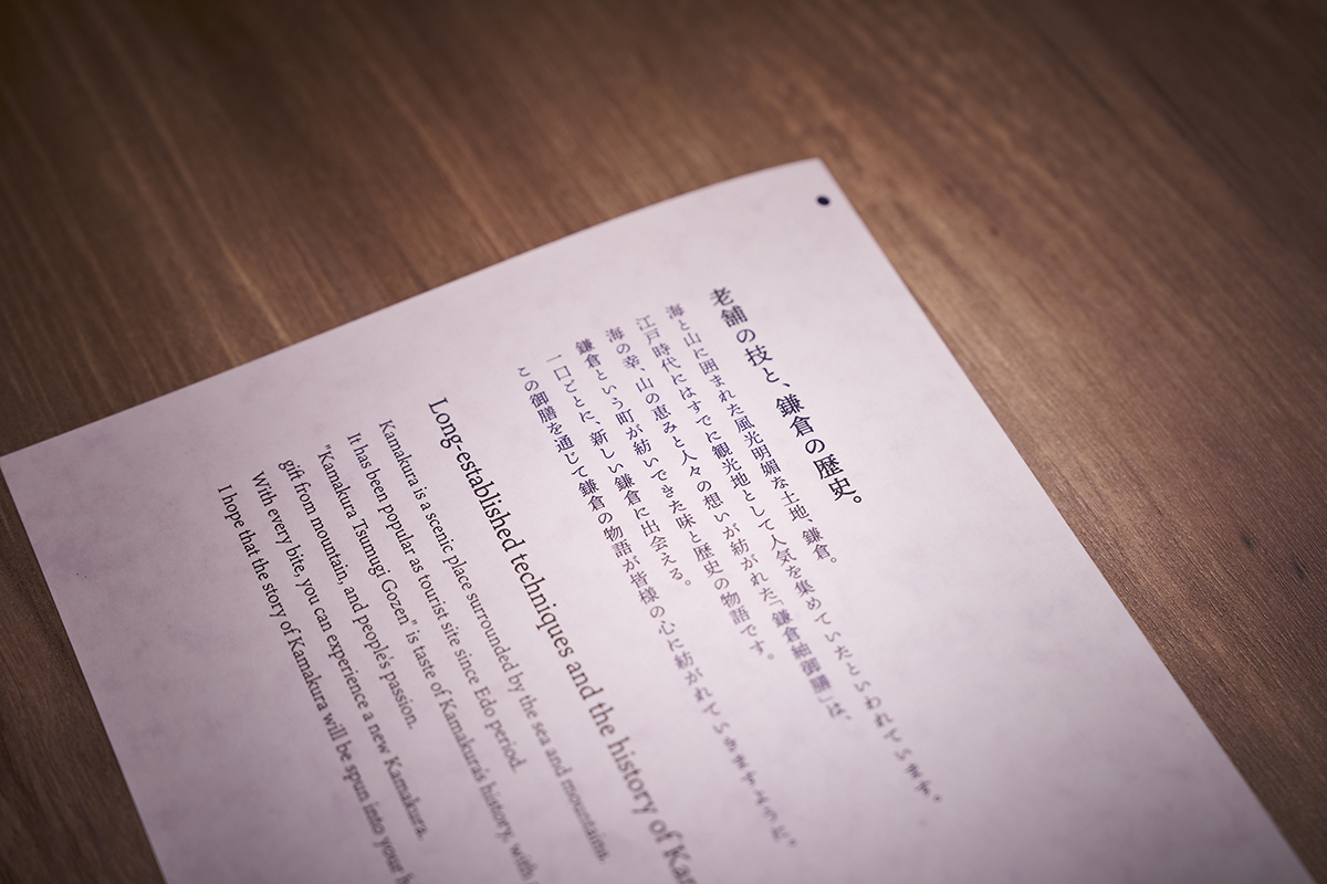 鎌倉の名店の味をゆっくりと味わえる、ぜいたく御膳。敷いてある紙に番号が振られているのは、美しく配膳するための工夫だそう。味だけでなく見た目の美しさにもこだわりが感じられます。