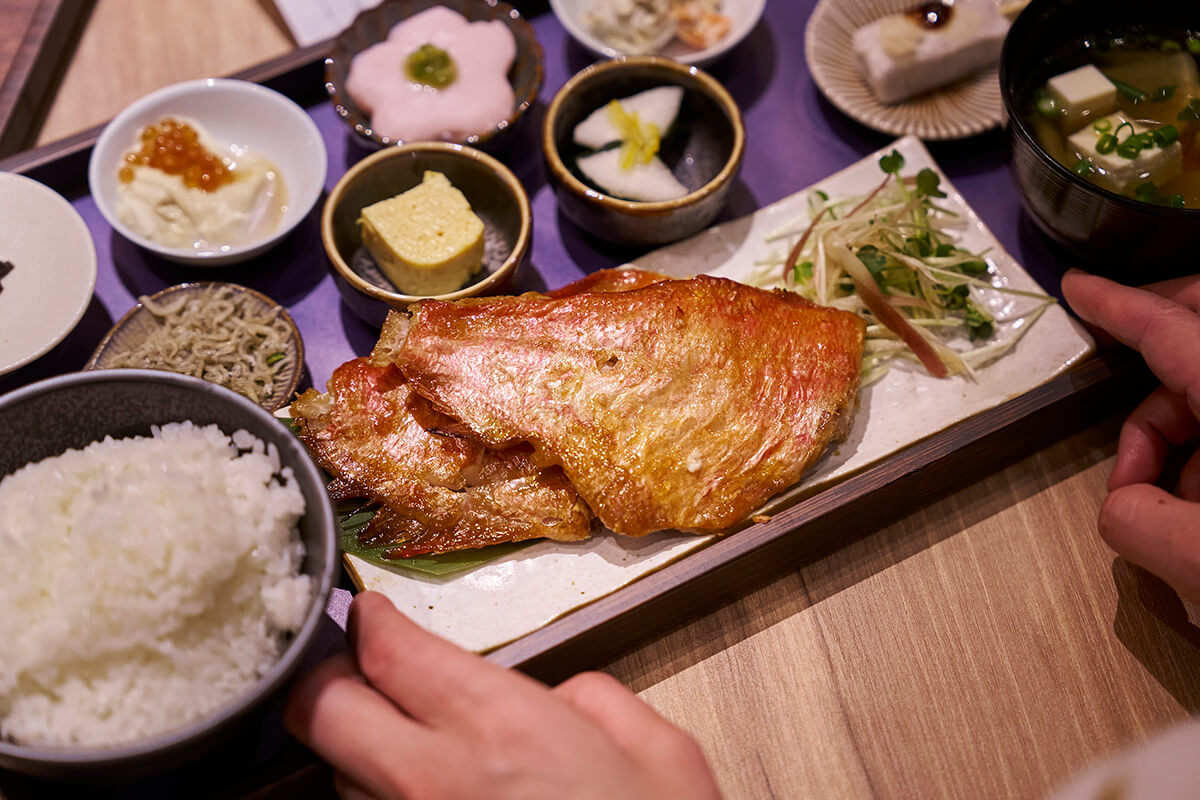 お魚の主菜は「金目鯛の西京焼き」。文久3年(1863)創業の老舗ひもの専門店「山安鎌倉店」のものです。金目鯛の切り身が山安オリジナルの西京味噌に漬け込まれており、ぎゅっと詰まった身と香ばしい香りで、ご飯が進みます!