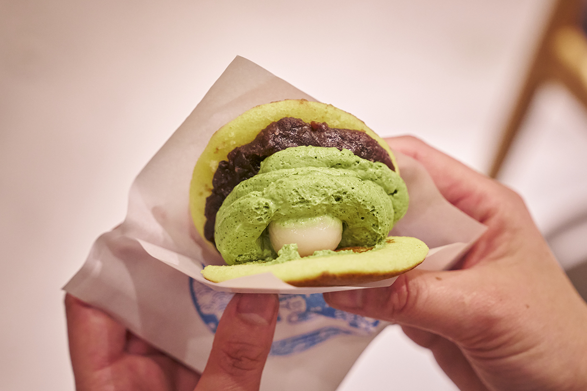 中には抹茶ムースとしっかりとした粒あんがたっぷり。ぷるぷるとした白玉と固形バターも入っています。すべての味が絶妙に絡み合い、上品な甘さ。食事の後でもぺろりと食べられてしまいます。
