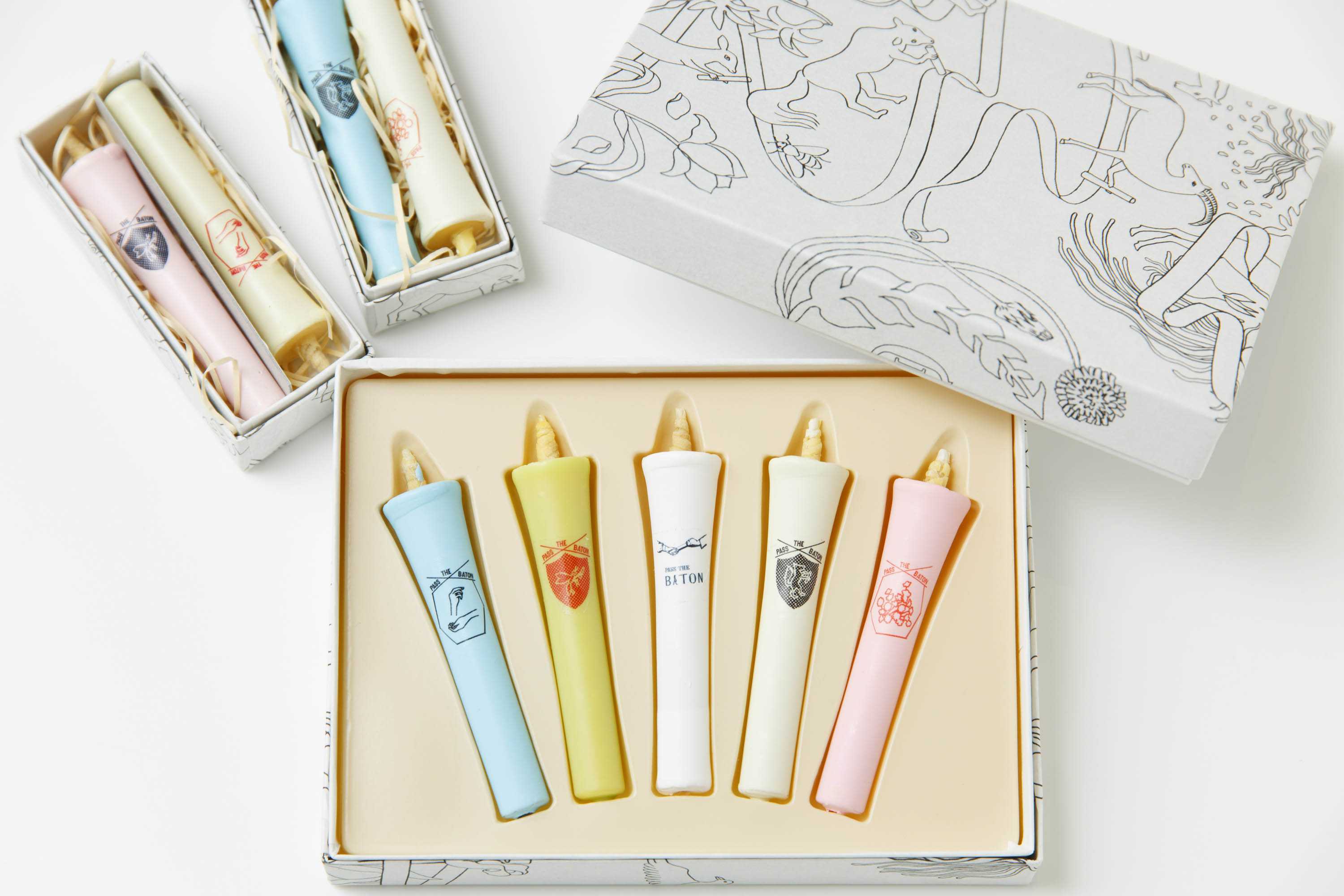 ポップな和ろうそくは、環境にやさしい米ぬかを原料に、米油を作る過程で余った蝋を再利用しています。「糠蝋色和蝋燭」2色756円、5色1620円。