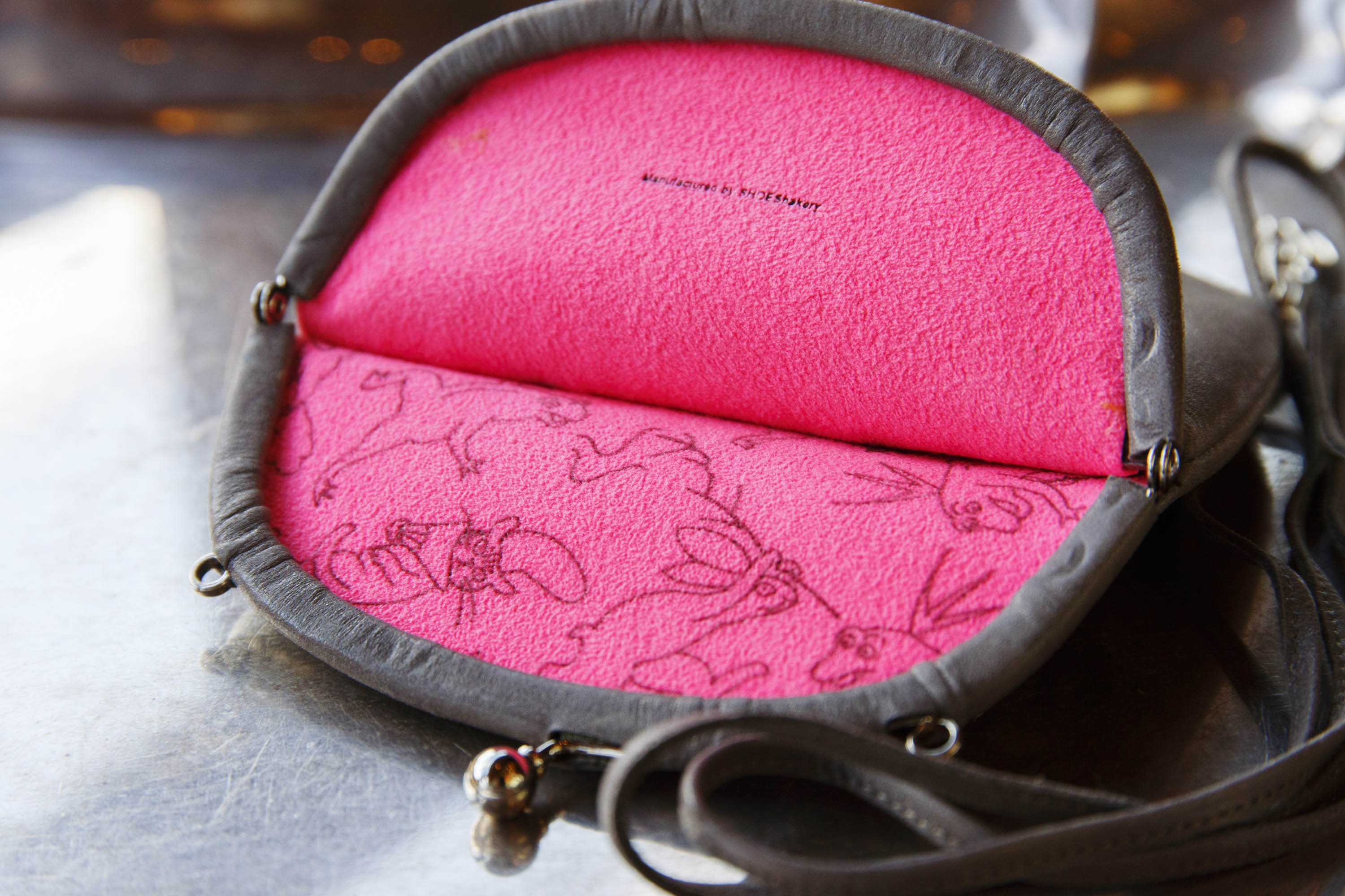 しなやかなレザーバッグは人気商品の「GAMAGUCHI ~LovedLeftovers~」(Sサイズ6264円~)。パンプスの生産工程で余った革を利用しているのがユニーク。京都祇園店限定の「鳥獣戯画」の裏地もカワイイ!