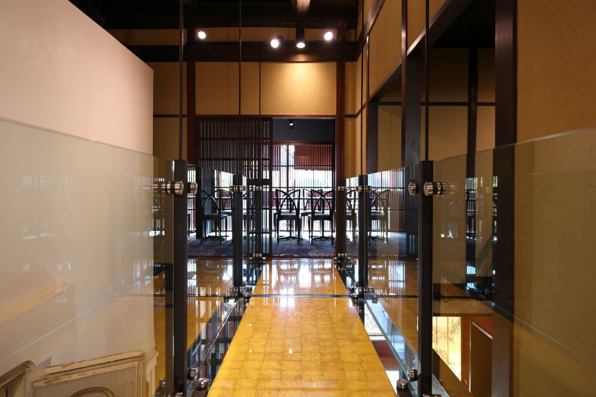 江戸時代当時の建築意匠を活かしつつ、現代アートのようなアプローチが見られるのも魅力です。2階にかかる渡り廊下は、ガラス素材に変更され金箔をあしらった通路に。あっ!と驚く人も多く、館内でも人気のフォトスポットになっています。