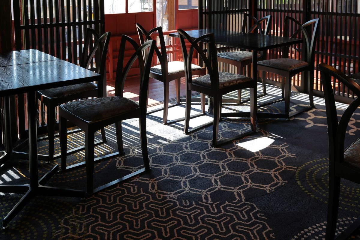 テーブルフロアの絨毯には、幾何学模様のデザインがあしらわれています。これは、茶屋街の南側を流れる浅野川で行われていた花火大会を表現したものです。川面に映る花火をモダンなデザインで再現しています。かつての茶屋街の風情をイメージさせてくれる粋な仕掛けです。