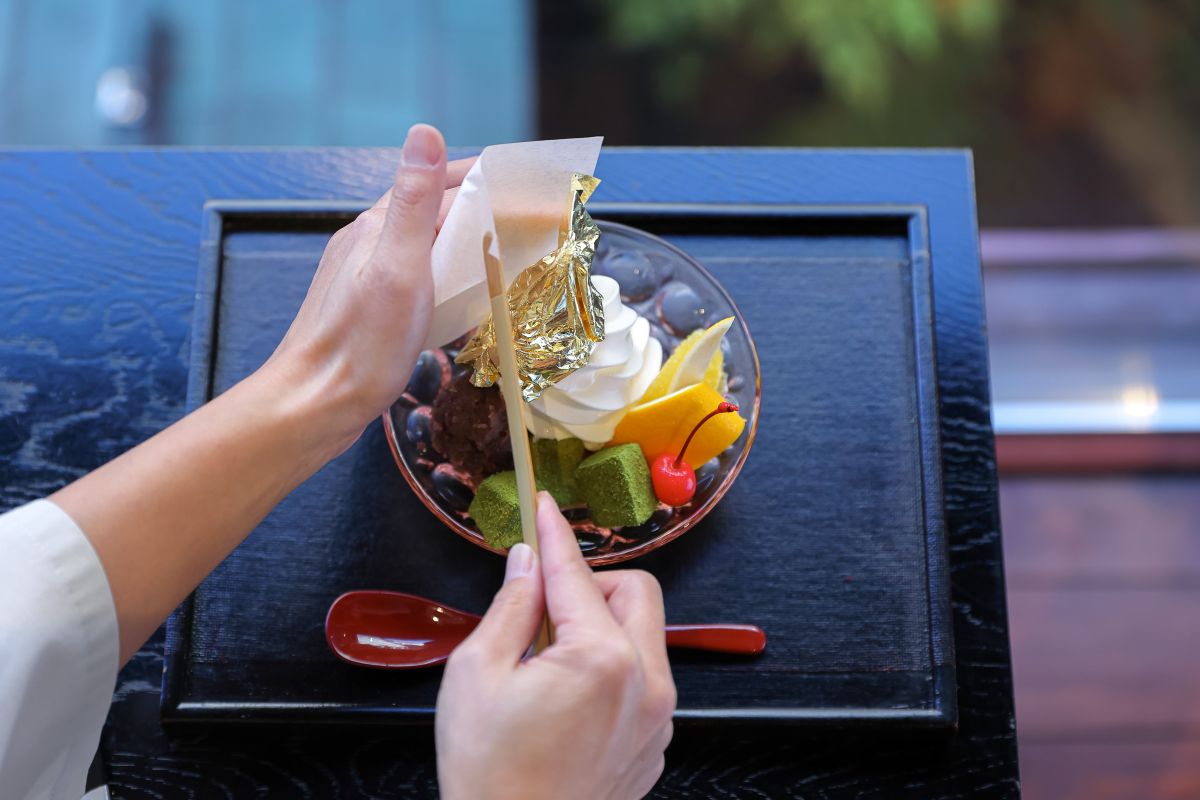 「茶房やなぎ庵」では、四季折々のフルーツを使用した甘味や、金沢の老舗のお菓子を提供しています。伝統工芸品の器などに盛り付けられる和スイーツの数々は、どれも品がありラグジュアリー。「金箔あんみつ」は見た目も金沢らしい人気ナンバー1メニューです。