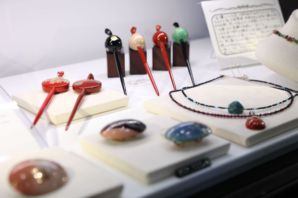 内蔵を利用した部屋では、さまざまな作家のアクセサリーをディスプレイ。漆、彫金、琥珀のオリジナルアクセサリーが並びます。