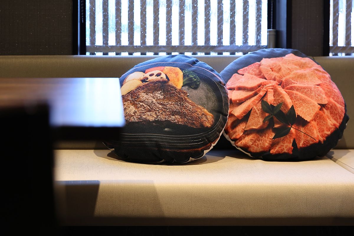 てらおか自慢の肉料理の写真をプリントしたクッションもあり、遊び心がうかがえます♪