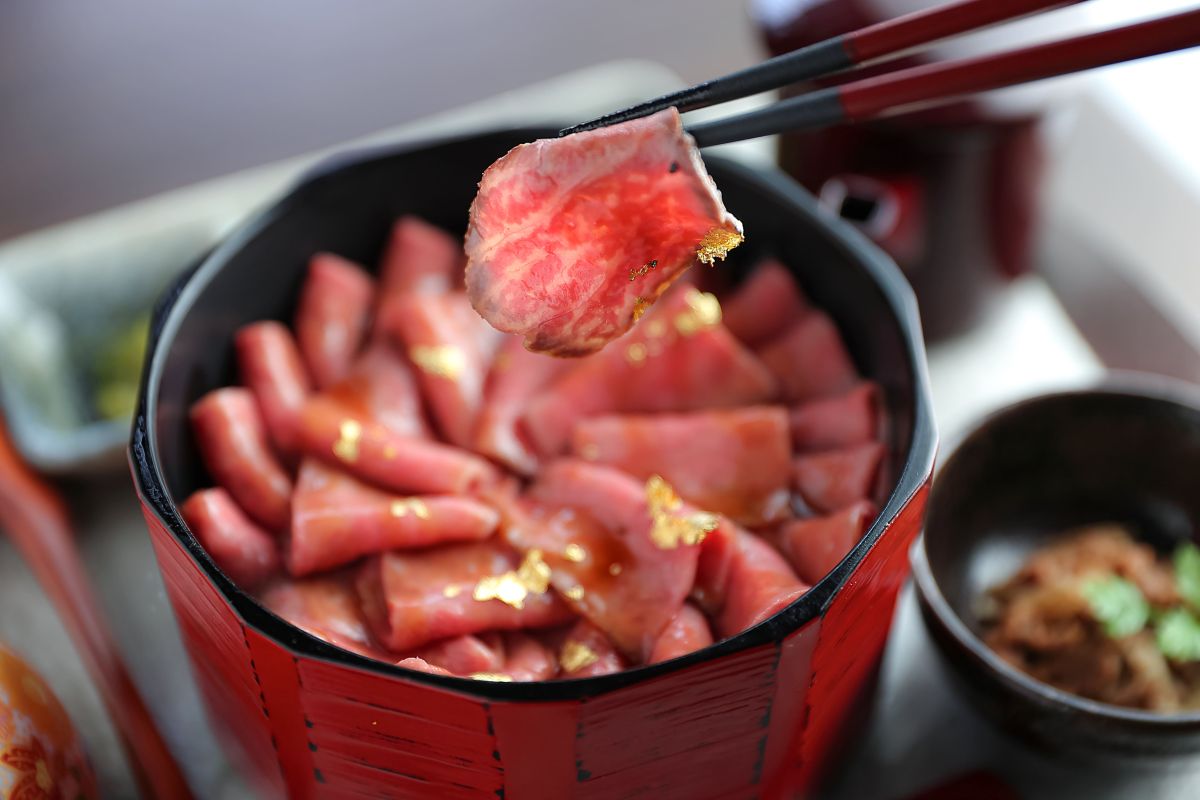 お花のように盛り付けられたローストビーフに金箔を振りかけたこちらの一品は、ひつまぶしスタイルで能登牛を味わえる「うしまぶし」です。しばらく眺めていたくなる、贅沢なビジュアル♪