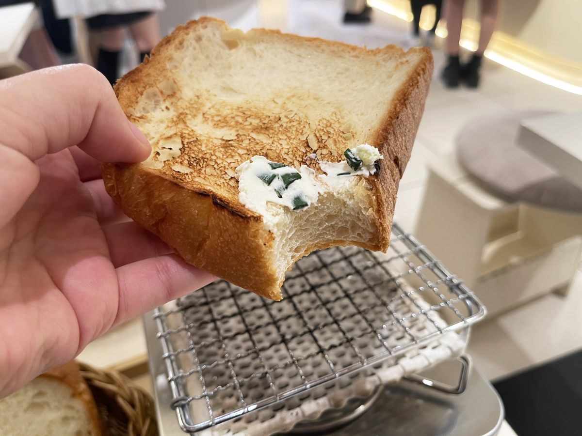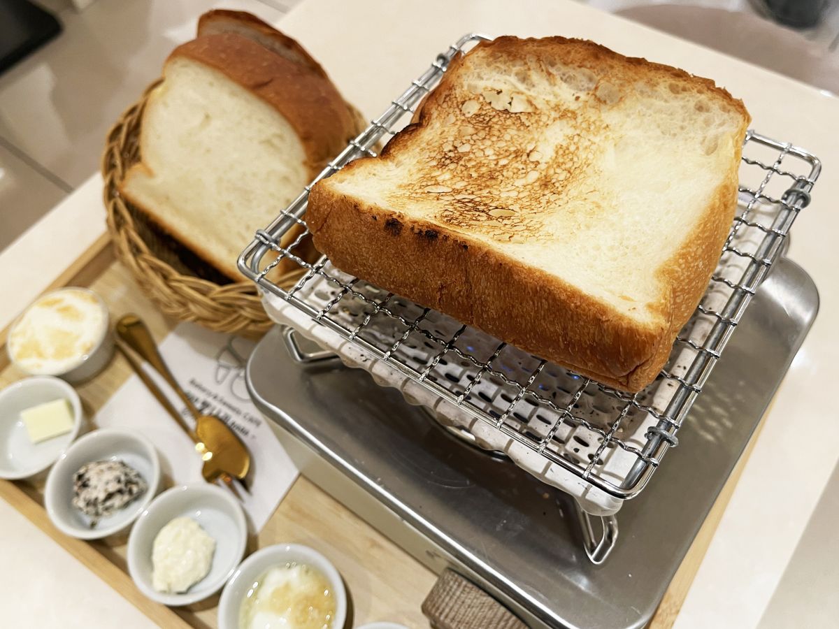 コンロの上でじっくり両面焼き上げてからいただきます。ベーカリーで焼きたてパンを食べることはあっても、自分でトーストして味わうのはなかなかない体験でドキドキ。