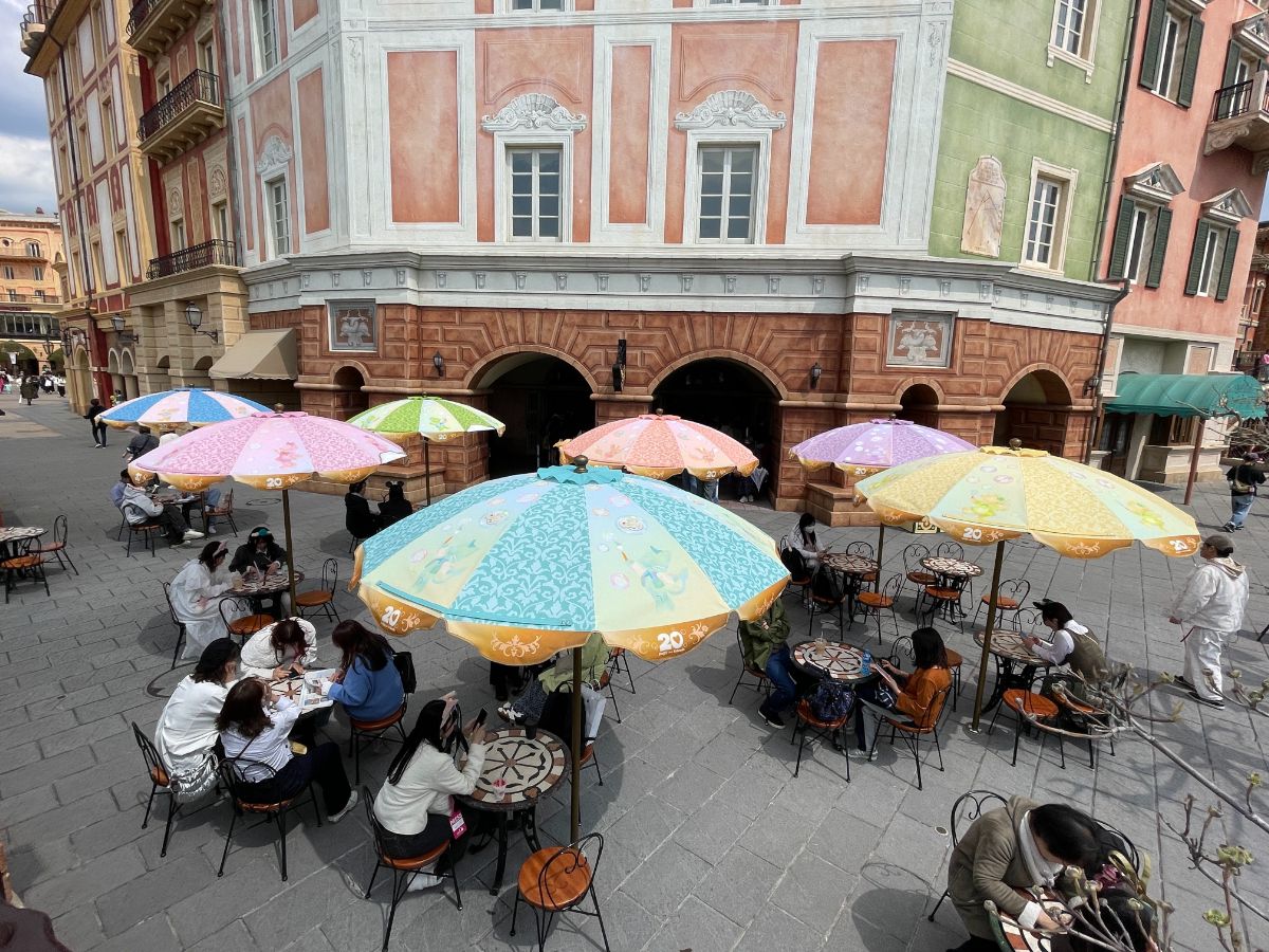 マンマ・ビスコッティーズ・ベーカリー前やゴンドリエ・スナック前のパラソルがダッフィーたちのシルエットが描かれたデザインに。