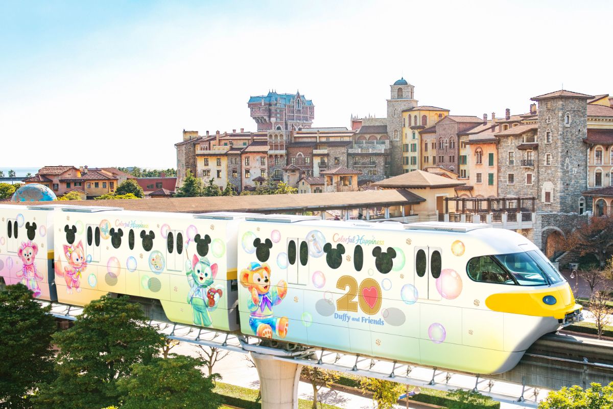 ディズニーリゾートラインでは、スペシャルイベント「ダッフィー&フレンズ20周年:カラフルハピネス」をお祝いして、ダッフィー&フレンズ・カラフルハピネス・ライナーを運行。