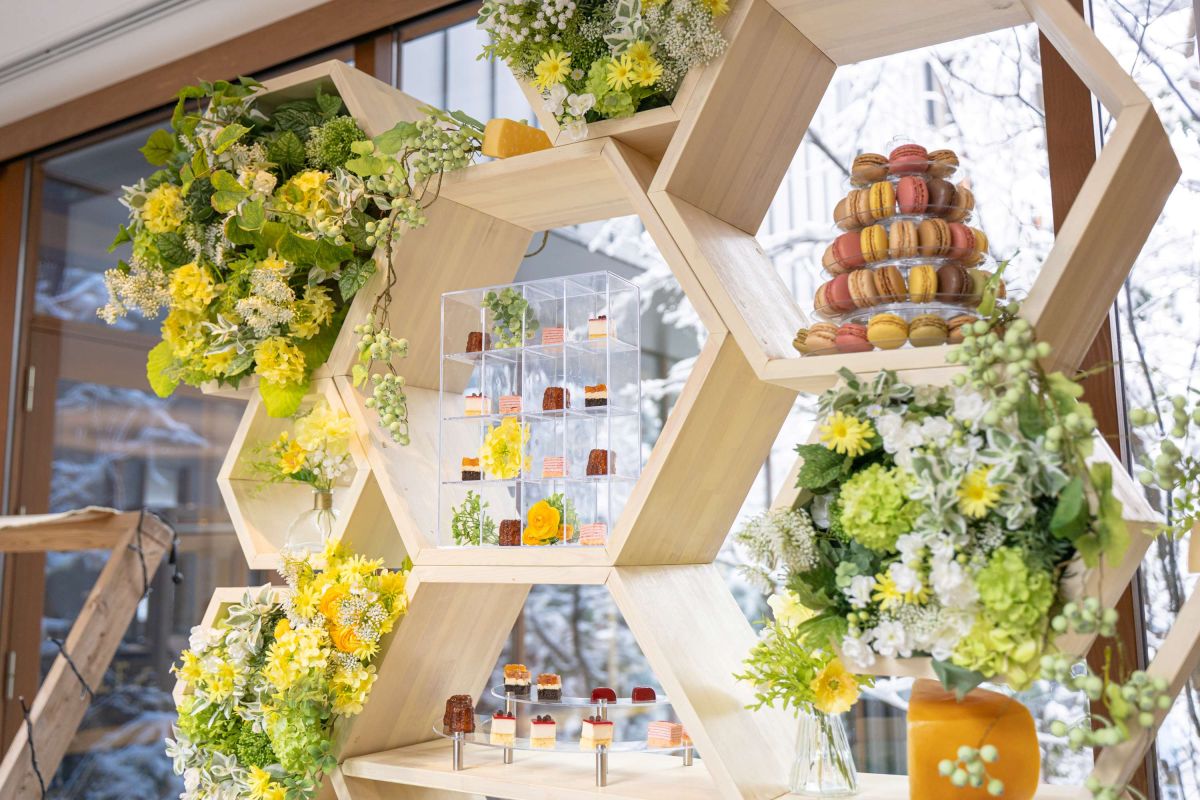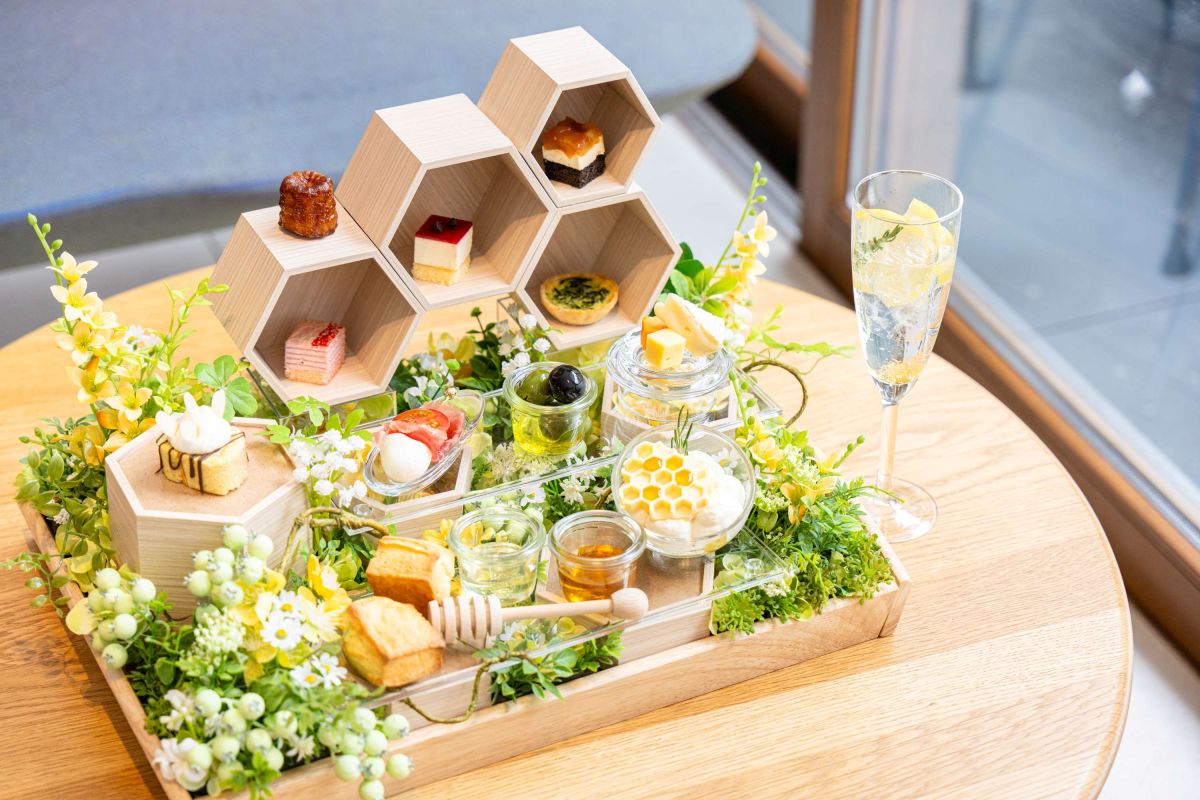 スイーツは蜂の巣をモチーフにしたミニスタンドに盛りつけることで、自分だけの「ミニはちみつアフタヌーンティーセット」を作ることができます。まるでお花畑を蜂が飛んでいるかのようなかわいらしいデザインに心も踊ります♪