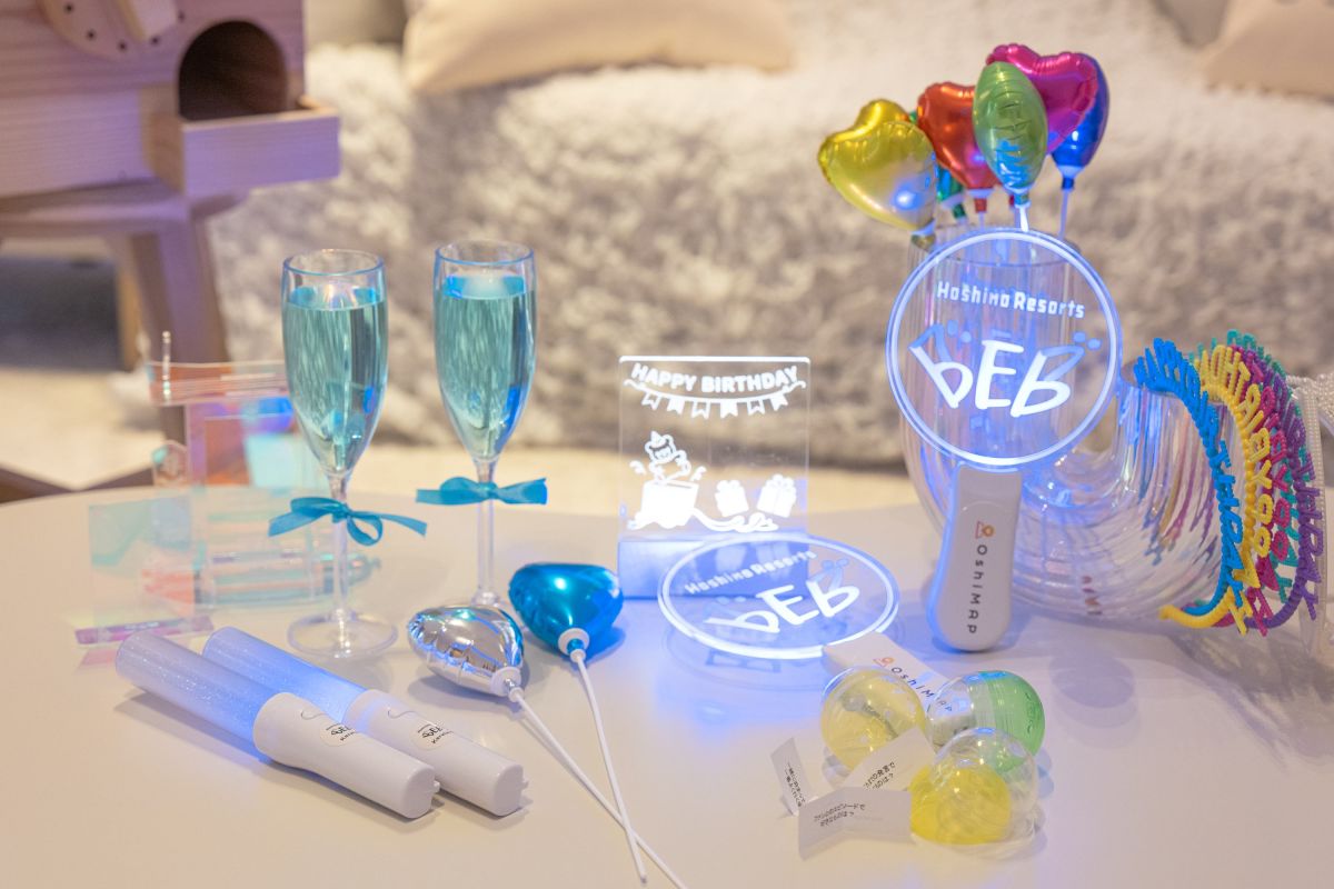 無料の貸し出しグッズも種類豊富に用意されています。ペンライトや推しカラーのハートの風船などのアイテムのほか、推しのバースデーを祝うのにもぴったりなケーキなども3500円(4号サイズ)で注文可能! 推しカラーに合わせたドリンクを持ち込むのもいいですね。部屋に設置された「推し活ガチャ」には、推し活にまつわるトークテーマが書かれた紙が入っているので、話題が尽きることもありません。