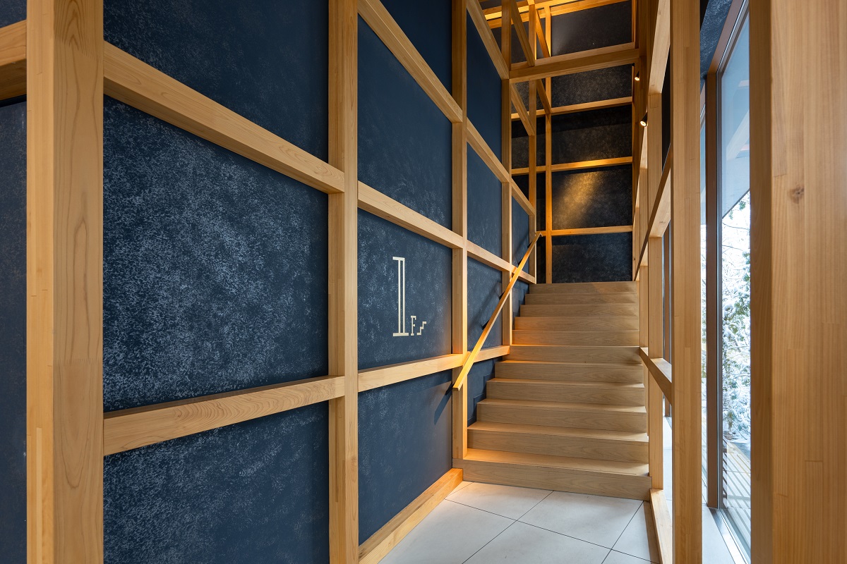 軽井沢の自然に溶け込むように造られた木造のホテル。木の温もりを感じる内装が随所に見られ、建物はウッドデッキの中庭をぐるりと囲む構造となっています。