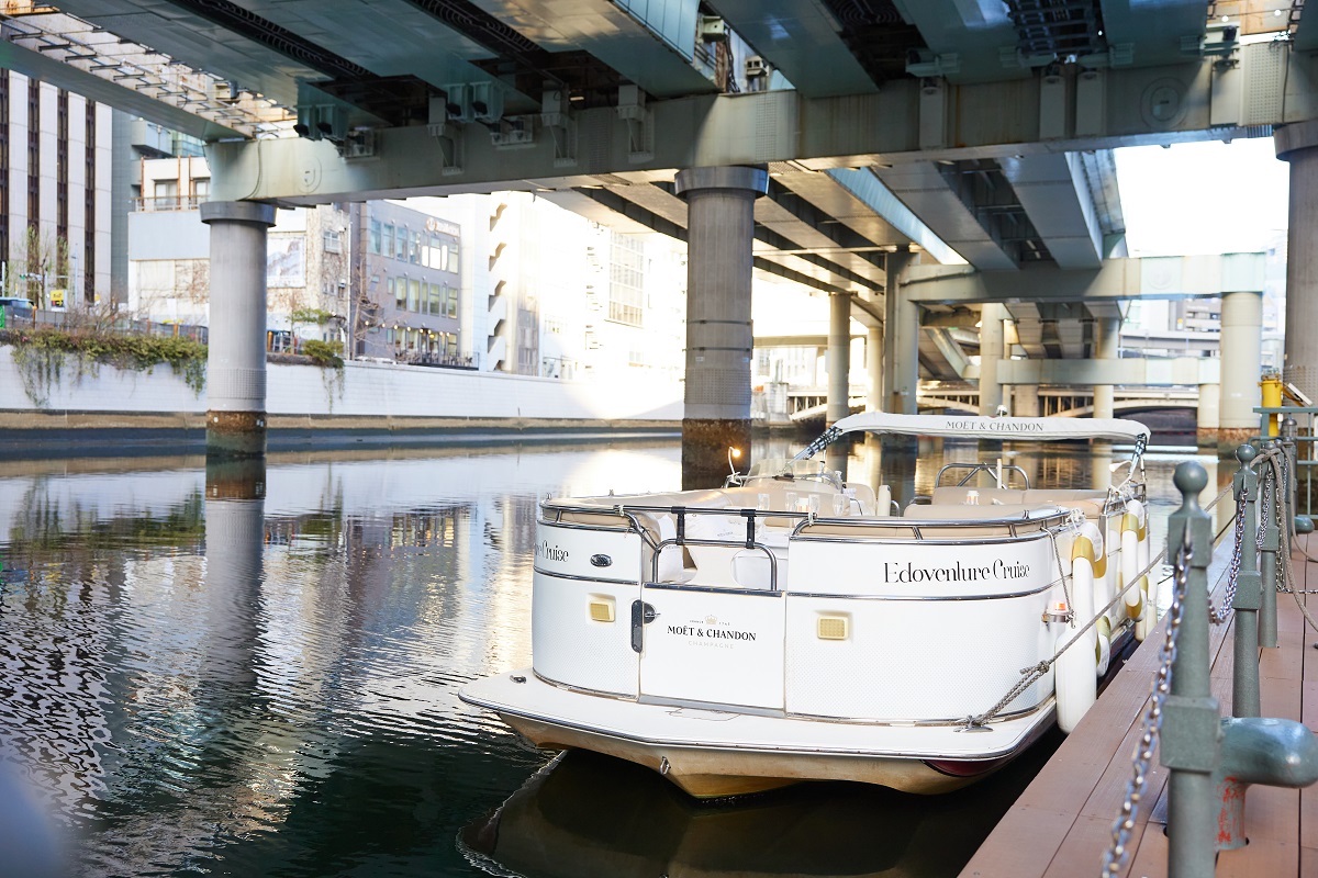 船上で過ごすのが気持ちいい6月や10月の利用が多いそうですが、一年のうちでもっとも人気なのは、3月下旬から4月初旬の桜の時期。「エドベンチャー」では、門前仲町を流れる大横川で両岸の桜並木を眺めながらゆっくりクルージングする「お花見クルーズ」も運航しています。下からの桜の眺めだけでなく、人混み知らずなのもクルーズの魅力のひとつ。タイプは、モエ・エ・シャンドン白とソフトドリンクのフリーフロー付き、モエ・エ・シャンドン ロゼとソフトドリンクのフリーフロー付きの2つから選べます(2025年は3月20日〜4月10日に実施予定。2025年2月現在、残りわずか)。
