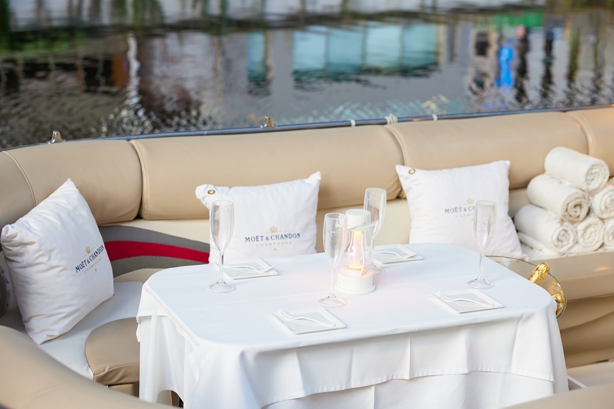 船内にはシャンパングラスとプレート、フォークがセットされたテーブル、モエ・エ・シャンドンのクッションが置かれたソファがあり、まるで小さなパーティールームのよう。