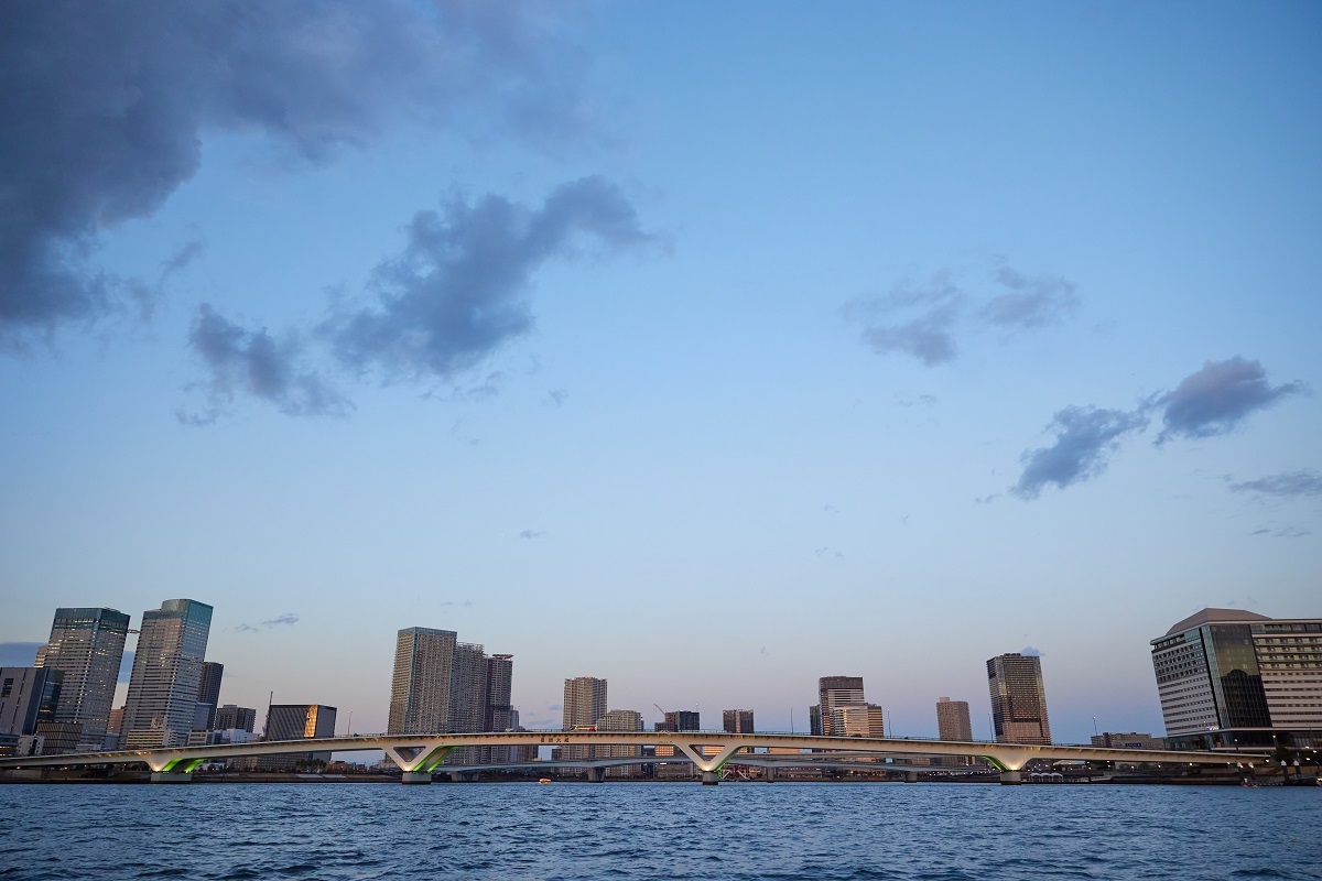 お台場でのひとときを過ごした後は、橋のライトアップが始まった橋を通過しながら、朝潮桟橋へ向かいます。