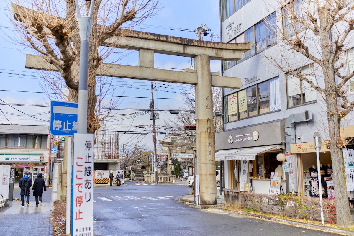 清水寺や高台寺へと参拝する際のアクセスの要となる東大路通に面し、高台寺南門通りへの入り口に2024年12月「まめものとたい焼き 高台寺店(まめものとたいやき こうだいじてん)」が移転オープンしました。鳥居のすぐ隣で、とてもわかりやすい場所にあります。
