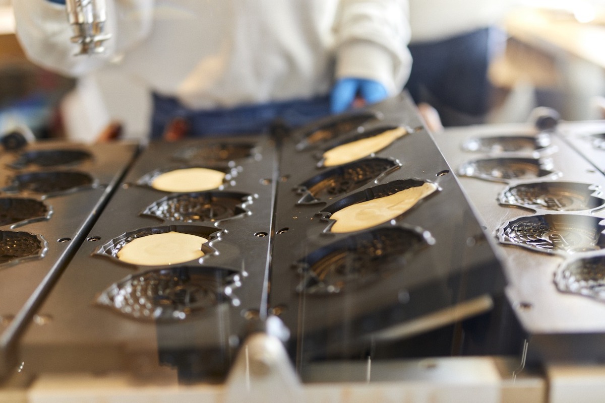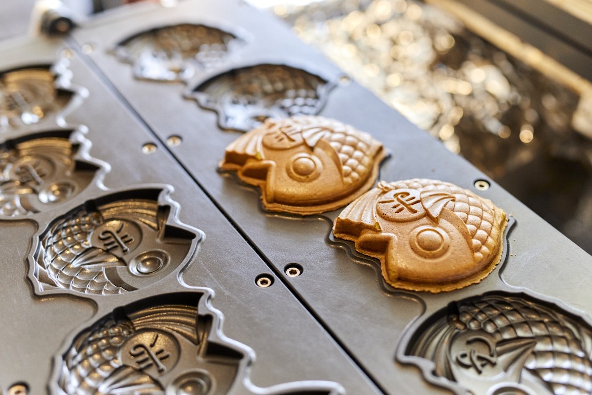 たい焼きの金型は「まめものとたい焼き」で企画・デザインを行い、仕上げに金型職人が製作した独自のもの。この金型が、香ばしく焼き上げて細かな線までしっかりと抜き出せる最大の理由なのだとか。表面に「ま」裏面に「め」の文字が刻まれて、裏と表で「まめ」。「まめ」には、勤勉や健康などの意味もあり、門前でいただくお菓子としてもぴったりです。