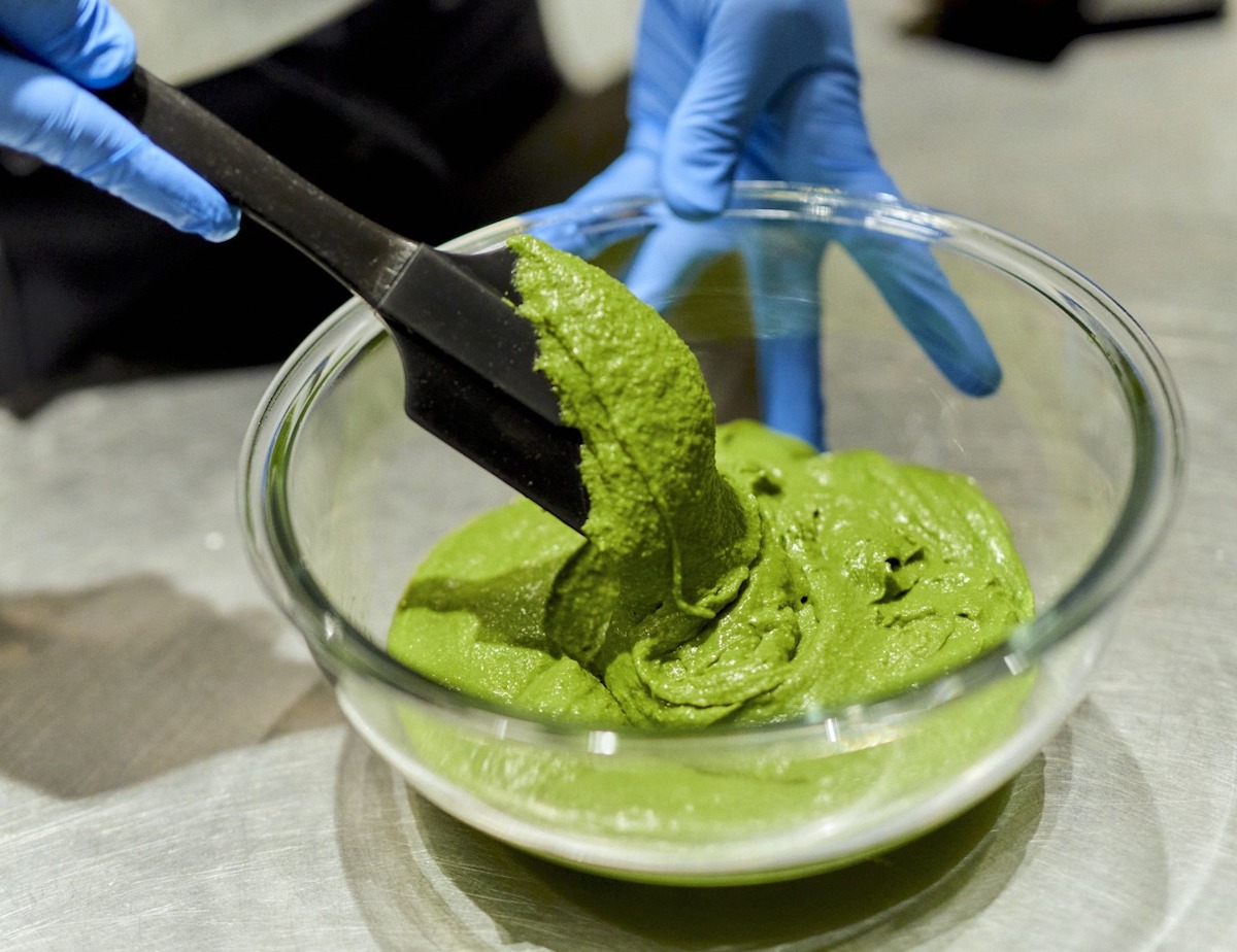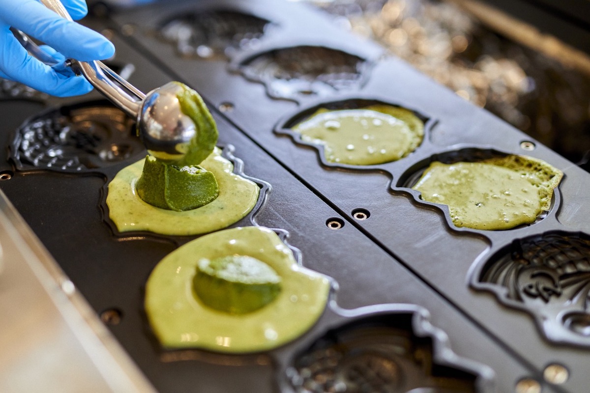 なぜ売り切れてしまうかというと“生”にこだわっているから。生菓子のシュークリームと同じ、京都産の新鮮な卵で作るカスタードクリームを使っているので、通常たい焼きに使うクリームと違い日持ちがしません。特製のカスタードに抹茶を加えて混ぜ、とろりとした口溶けになるように丁寧に加熱・裏漉しして仕上げる贅沢な抹茶カスタードクリーム。
