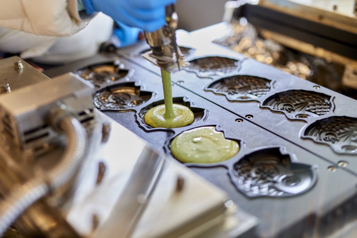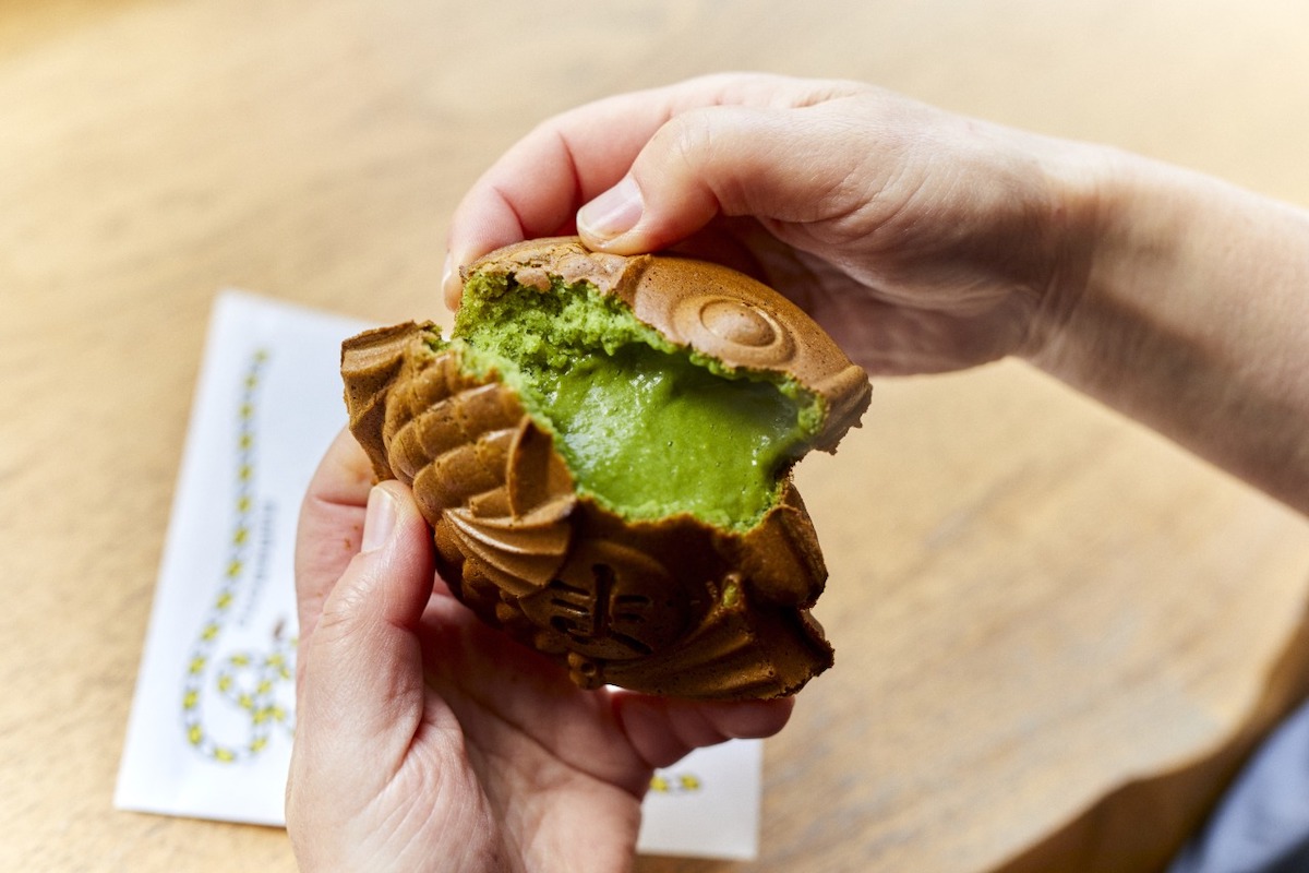 その作りたてのクリームをたい焼きに入れているため、当日準備していた分がなくなったら終了。生地にも、クリームにも、京都の老舗茶問屋「森半」の宇治抹茶が使われています。「まめものとたい焼き」を運営している母体も「石田老舗」という京都の老舗だからこそ。このたい焼きには京都の老舗の粋が詰まっています。