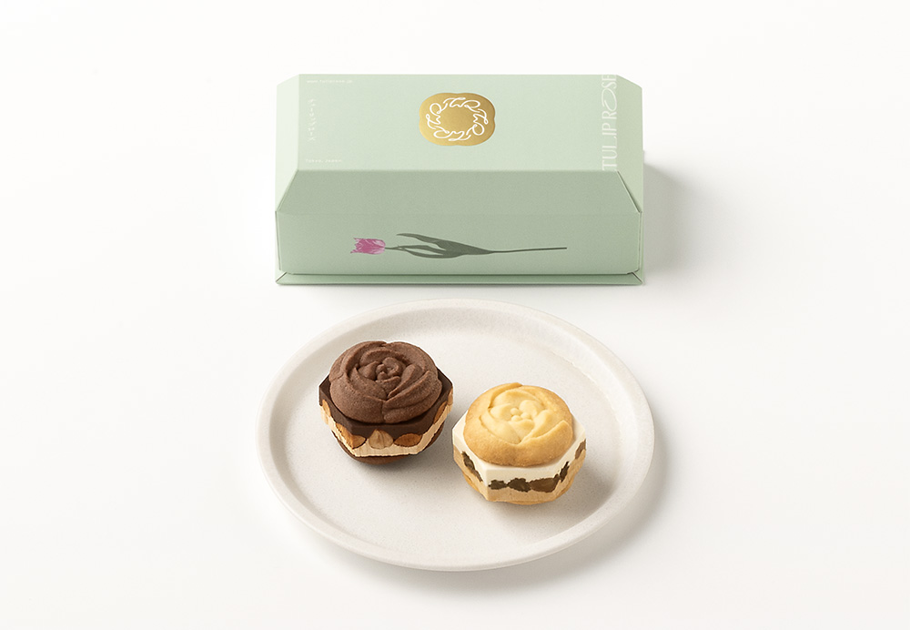 代表作「チューリップローズ」の濃厚なコクや芳醇なおいしさはそのままに、ジューシーな味わいや多彩な食感を惜しみなく加えた2層の生仕立てにグレードアップ! そして仕上げに「チューリップローズ」を真上から眺めた姿をかたどったサブレでサンドしています。