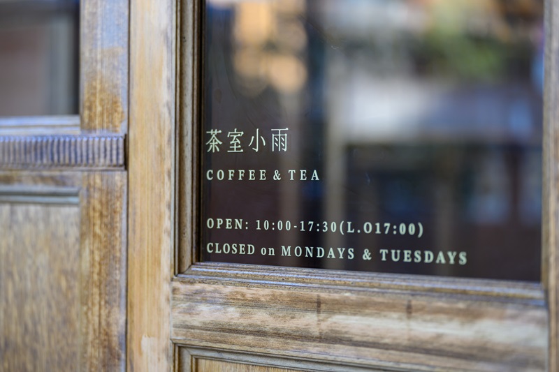 「茶室 小雨」が位置しているのは金沢市橋場町。金沢の主要観光スポットの兼六園とひがし茶屋街のちょうど中間地点です。徒歩観光の休憩に、気軽に立ち寄りやすい場所にあります。アンティーク調の大きな木の扉が目印です。