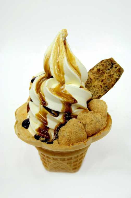 山梨県の銘菓「桔梗信玄餅」とソフトが合体した、あいぱく不動の人気アイス「桔梗信玄ソフト」500円。黒みつを染み込ませた“きなこ棒”がいいアクセントに!恋い(濃い)抹茶ソフトがおいしい「梗信玄ソフト吟造り+恋い抹茶」540円もお試しあれ。