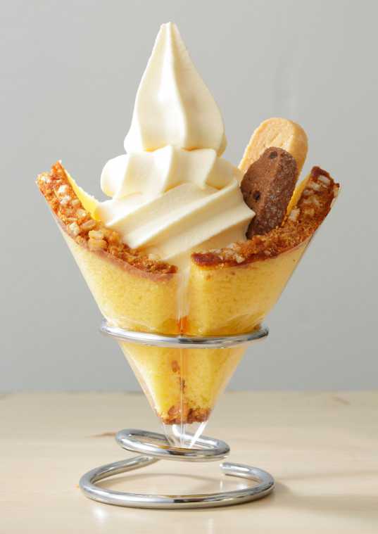 ザラメ入りの手焼きカステラと、上質なソフトクリームのバランスが絶妙!長崎・ニューヨーク堂の「長崎カステラ生ソフト(プレーン・抹茶)」各540円は、長崎の本店とあいぱくでしか食べられない貴重なメニュー。