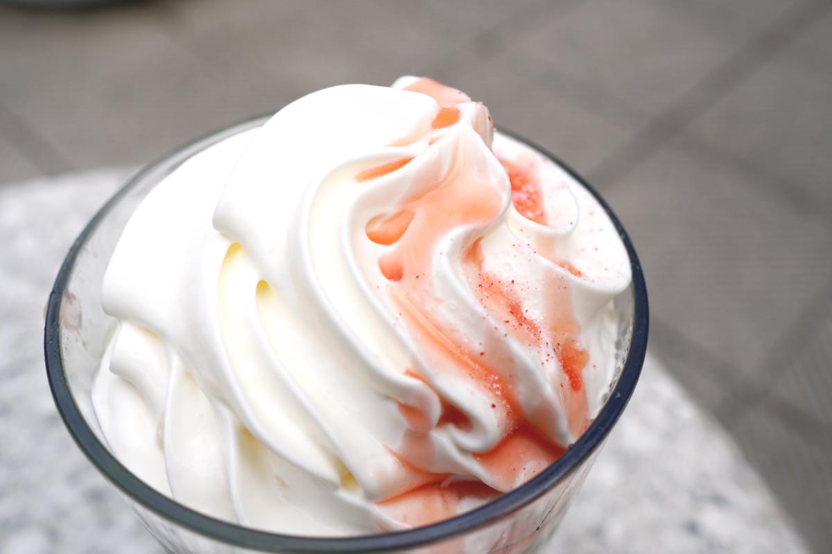 店員さんに相談したところ、おすすめされたのがキャラメルソース追加(無料)です。試してみたところ、桜とイチゴのソースとよく合う! クセになる甘さでステキなアクセントに。