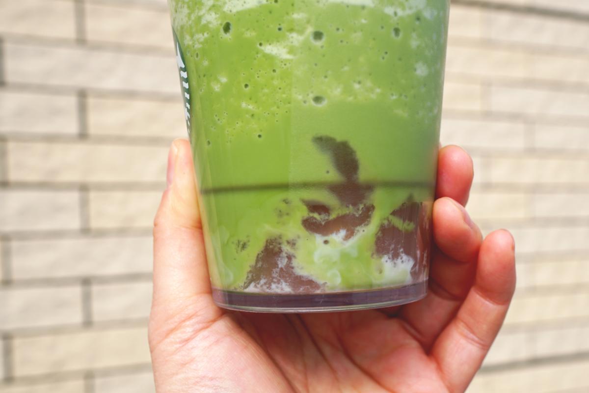 抹茶味のフラペチーノといえば、つい試したくなってしまうのがチョコレートチップ追加(+55円)。実際に試してみたところ、合う! プチプチ食感とチョコの風味が加わってお菓子感がUP!