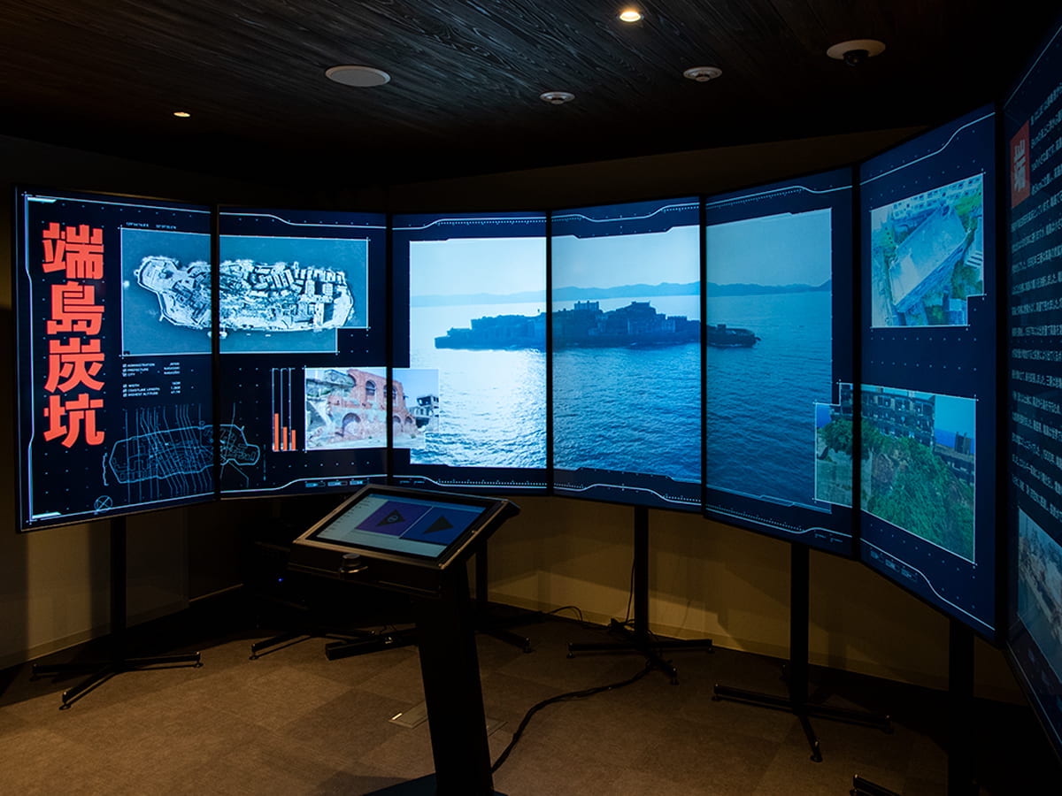特徴はビジュアルイメージが多用されていること。ビジュアルと併せて解説を読むと、産業遺産が果たした役割や価値がよく理解できます。写真パネルは60以上あり、7面の大画面体感型マルチディスプレイ「リキッド・ギャラクシー」では、自分で選んだ産業遺産の当時の写真や古地図、動画などを使った迫力ある解説が見られます。