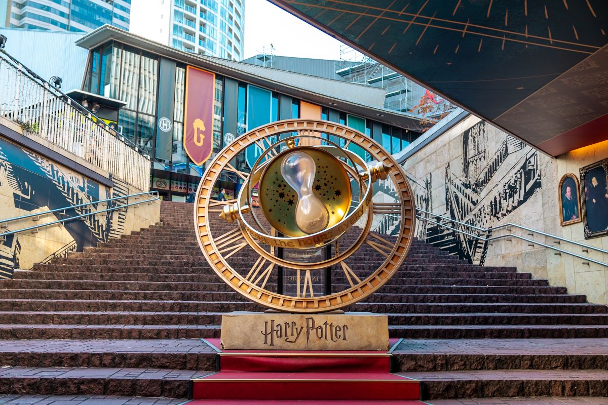 東京メトロ赤坂駅へ到着すると、さっそくタイムターナー(逆転時計)がお出迎え。こちらは地下鉄赤坂駅3b出口から地上へとつながる階段部にある「Wizarding World Gate」。中央には映画や舞台でも登場する重要なアイテムのタイムターナー。まずはオブジェの前で記念の一枚を!