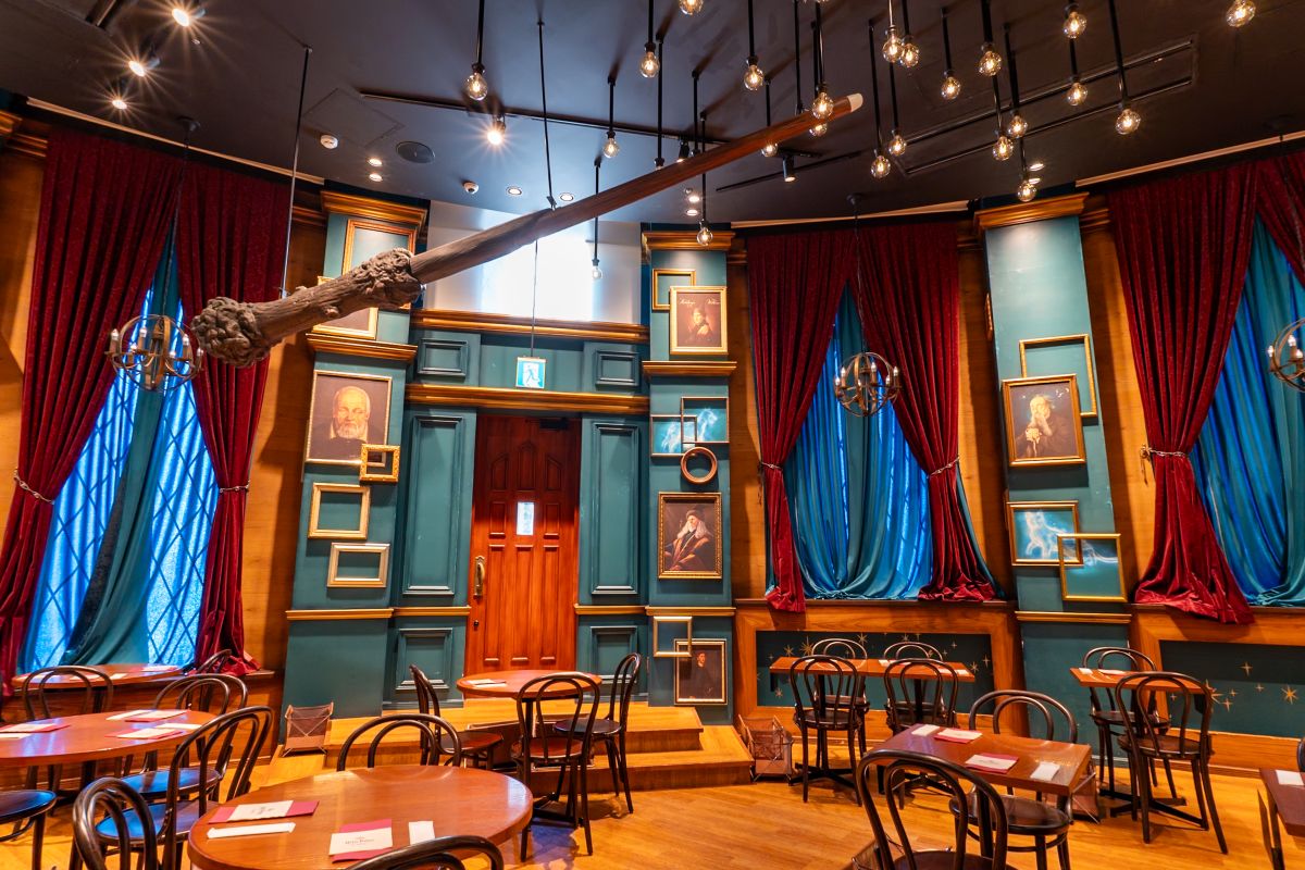 見どころは店内にも。大きな杖が天井から吊るされ、杖から放たれた魔法のように照明がキラキラと店内を彩ります。まさに「ハリー・ポッター」の作品内に迷い込んでしまったかのような空間に、ファンでなくともテンションが上がるはず!
