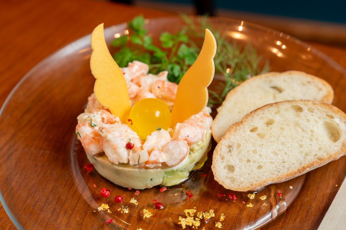 こちらはサイドメニューの「ゴールデン・スニッチ アボカドシュリンプ」1490円。アボカドポテトのサラダとエビのタルタルの上には、魔法界のスポーツ「クィディッチ」の重要なアイテムである「金のスニッチ」をかたどったモナカとコンソメゼリーがオン!食べるのがもったいないほどの盛り付けにうっとりしますね。