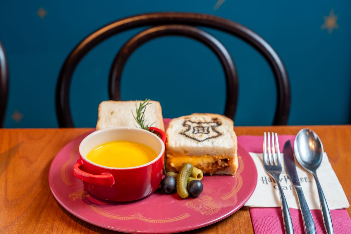 こちらはメインの「ホグワーツ チーズトースティー グリフィンドール ~ビーフ&オニオン」1990円。ホグワーツ魔法魔術学校の寮のひとつ、グリフィンドールをイメージしたチーズトースティーです。パンプキンスープもついて満足感たっぷりのひと品です。