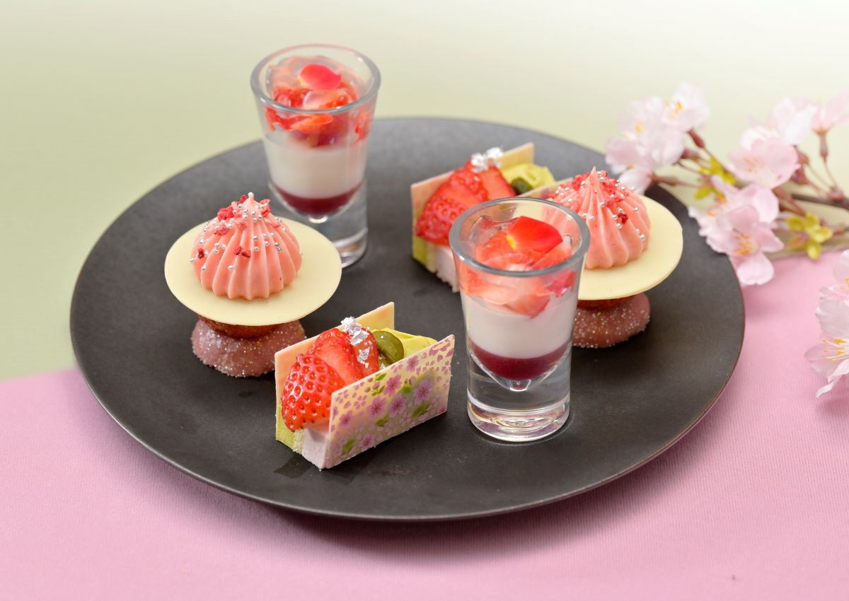 グリオットチェリーのジュレ、パンナコッタ、桜ゼリーを層にした、春を感じるグラスデザート。