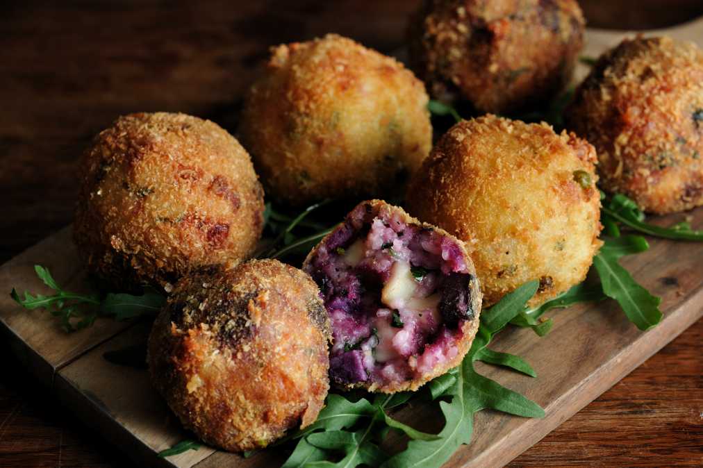 中でも人気なのが、ホットディッシュ「アランチーニ」(650円)。白米やさつまいも、紫いも、モッツアレラチーズがたっぷり入ったライスコロッケです。チーズのコクと衣のサクサク感、もっちりとしたお米の食感が特徴の「FRANZÈ& EVANS LONDON 表参道店」の看板メニューなのだそう。