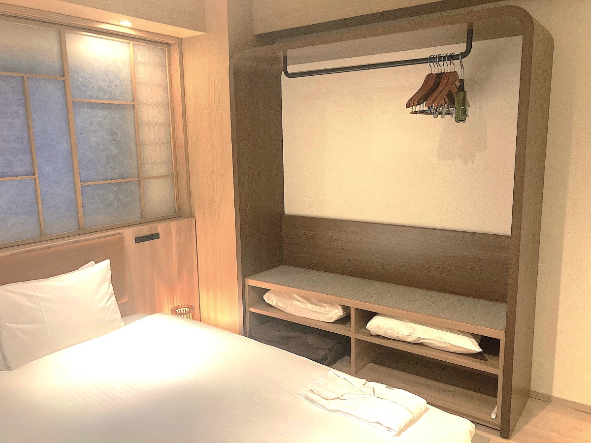 収納スペースはシンプルなデザインで、限られた客室スペースを広く見せる効果があります。ちょうど一間(約1.8m)ほど幅があるので、機内持ち込みサイズのスーツケースであれば横に寝かせて2つ並べられるくらいの余裕があります。