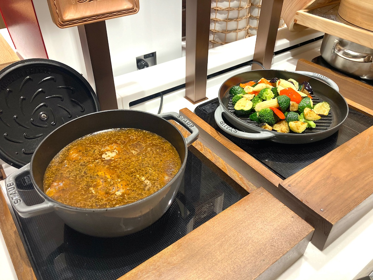 一度食べたらハマってしまう大人気のご当地グルメ、スープカレーは焼き野菜をトッピングして彩りよく。「ななつぼし」のご飯と一緒に食べてもいいし、スープとして楽しんでもいいですね。
