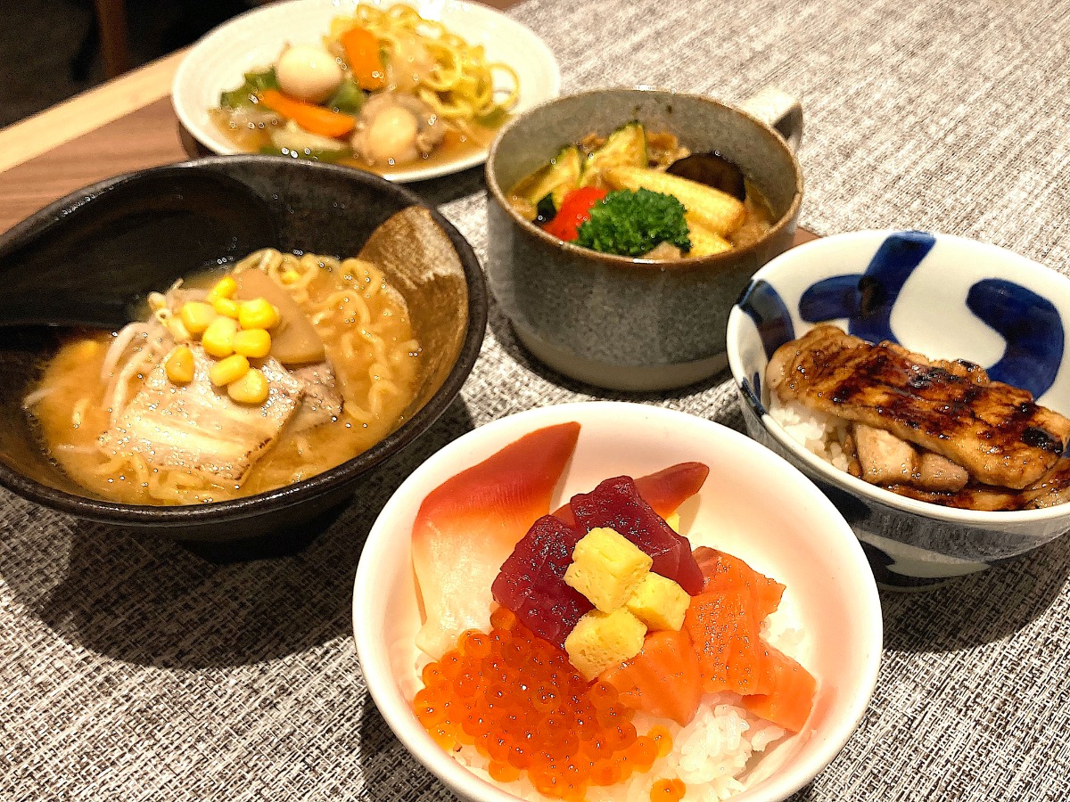 ビュッフェ台に並ぶ海鮮丼やスープカレー、小樽のあんかけ焼きそばは、自分で盛り付ける量が選べるのでひと口ずつ食べてみるのもいいかも。