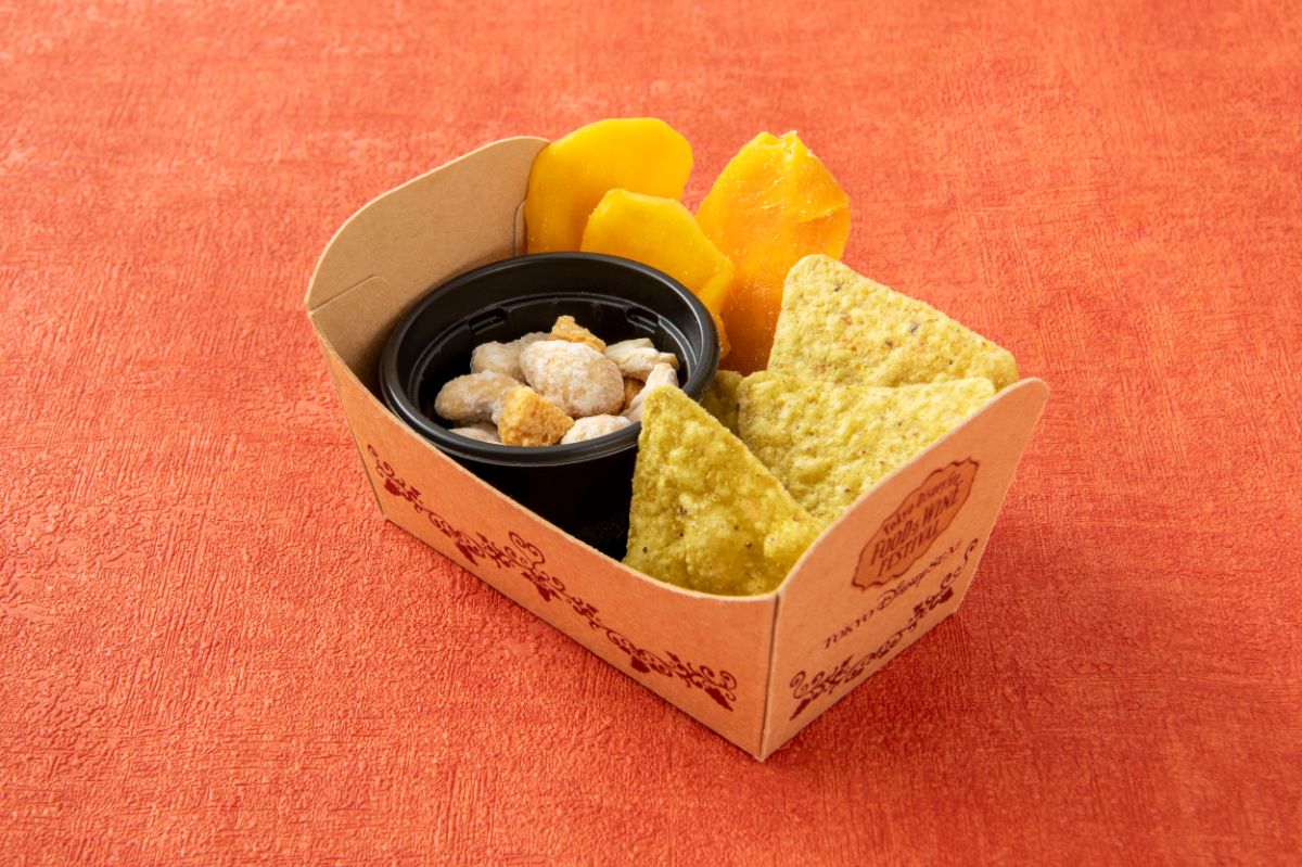 「アソーテッドスナック(カシューナッツ&チーズクルトン、ドライマンゴー、コーンチップス)」600円 【テディ・ルーズヴェルト・ラウンジ テラス席】