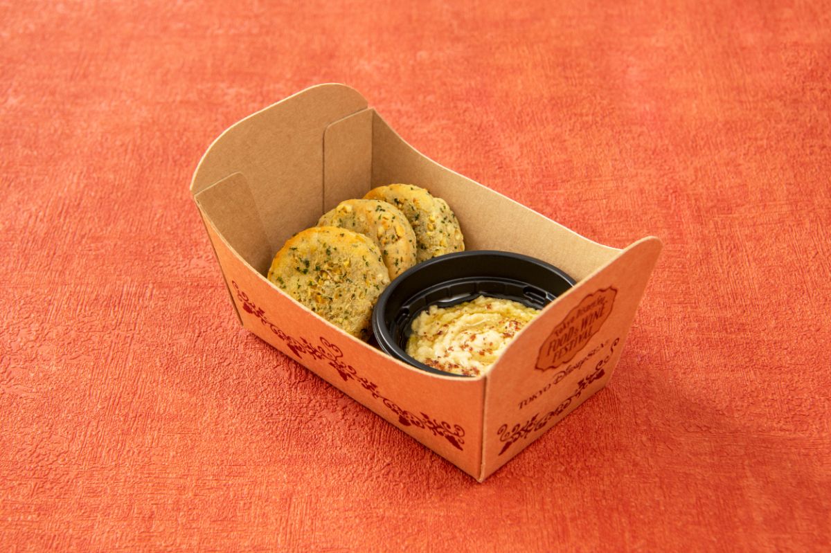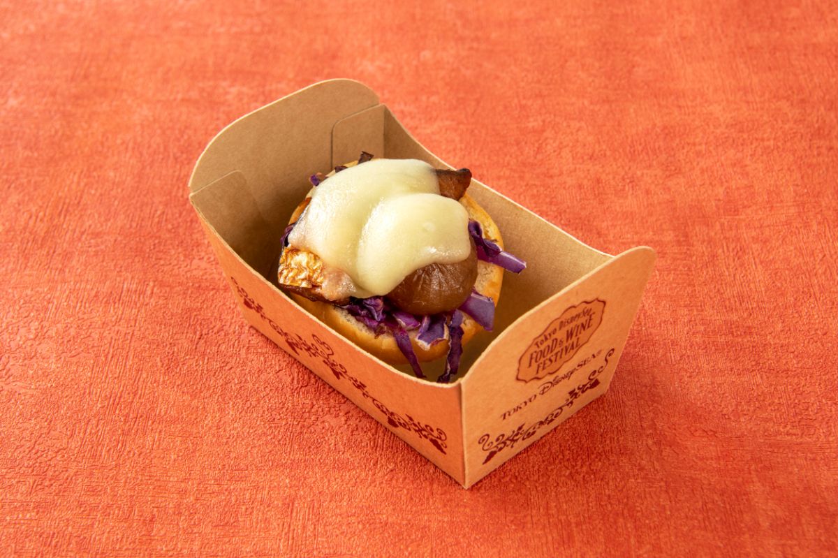 スモークチキンのムースと、ガーリックやハーブが香るフレッシュチーズをのせたカナッペ。チーズがミッキーシェイプなのもうれしいですね。こちらも「ワインセット」や「ビールセット」と楽しめる「テイスティングセレクション」1800円があります。