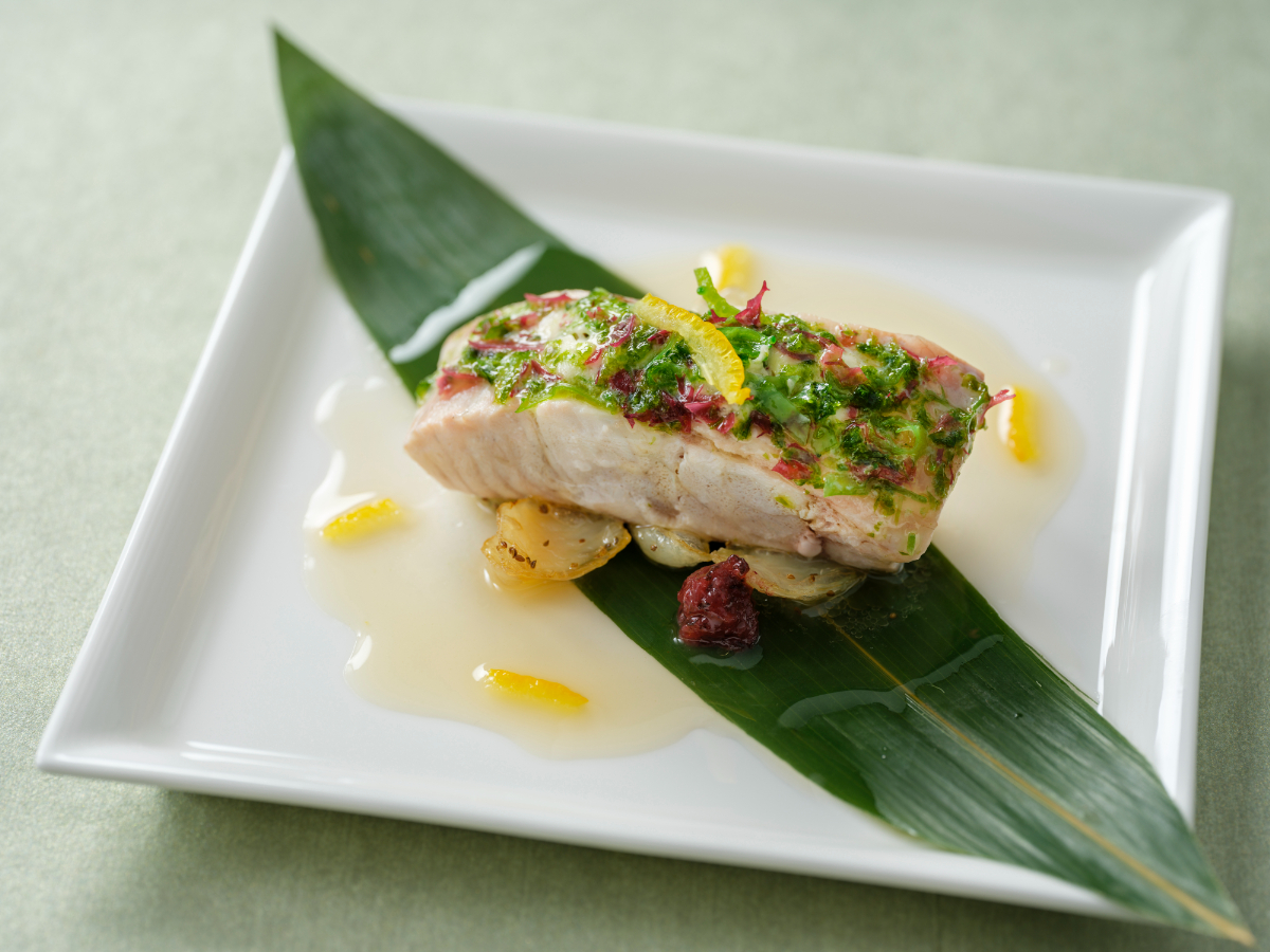 「スズキのスチーム、海藻バターソース 柚子と梅肉添え」1500円 【テディ・ルーズヴェルト・ラウンジ】