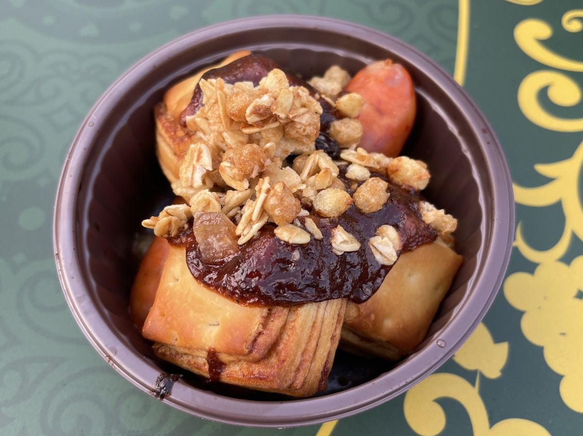 カルビーの「フルグラ®」を使ったメニューで、ザクザク食感が楽しい一品。甘さと酸味が絶妙なBBQソースにシナモン味のさくさくパンがよく合います。ソーセージは思った以上にスパイシー!辛いのが苦手な方はご注意を。